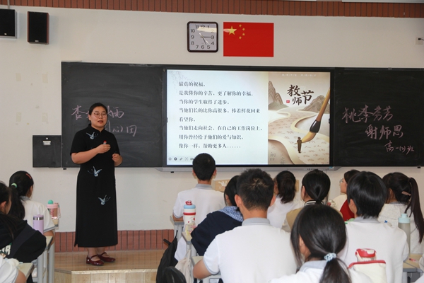班會上,主持人借助精心準備的PPT,與同學們共同回顧了與老師相處的溫暖瞬間:課堂中孜孜不倦的講解,課后耐心細致的輔導,生活中無微不至的關懷……每一幀畫面都承載著老師們沉甸甸的付出與愛。在互動分享環節,同學們踴躍發言,有的講述老師幫助自己攻克學習難關的經歷,有的回味在迷茫時老師給予的鼓勵和指引。樸實的話語中流淌著深深的敬意與感謝。各班還從教師節由來切入,展開熱烈討論,進一步理解師道傳承的意義。