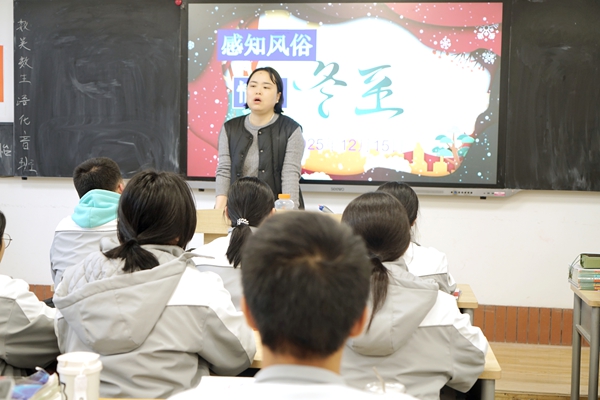 高一、高二年級的冬至主題班會則彰顯出濃厚的文化意蘊。教師通過微課講解,梳理冬至從古時祭祀到現代團圓習俗的歷史演變,闡釋南方食湯圓、北方吃餃子的飲食傳統差異,并引用《漢書》記載及相關民諺,解讀節氣文化內涵。精選的民俗紀錄片生動展示了祭祖、數九等傳統習俗。討論環節中,學生們分享了家鄉的冬至特色,探討了傳統節日在當代的傳承意義。部分班級還組織了知識競答、冬至詩詞朗誦等活動,使學生在沉浸體驗中感受文化脈絡,在交流互動中增強對中華傳統的認同感。