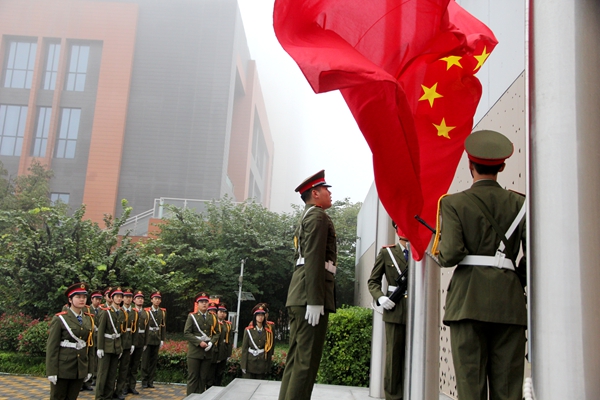國旗隊步伐鏗鏘、意氣風發,護衛國旗莊嚴入場。在雄壯的國歌聲中,全體師生肅立齊唱,注視著五星紅旗冉冉升起,迎風飄揚于校園上空。