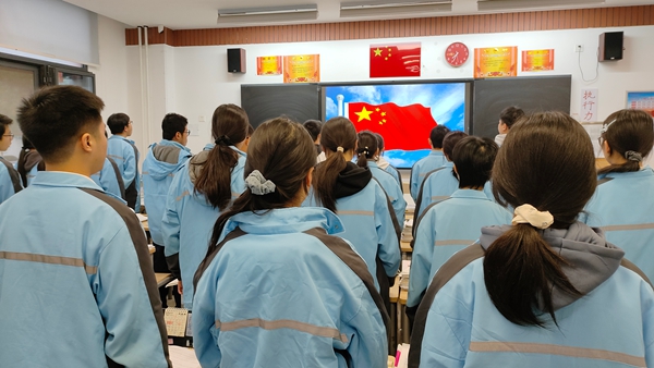 國歌奏響,全體師生昂首肅立,凝神注視著冉冉升起的五星紅旗,目光堅毅有神,齊聲高唱國歌,莊重的氛圍中盡顯師生愛國熱忱。