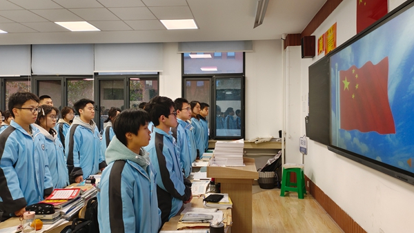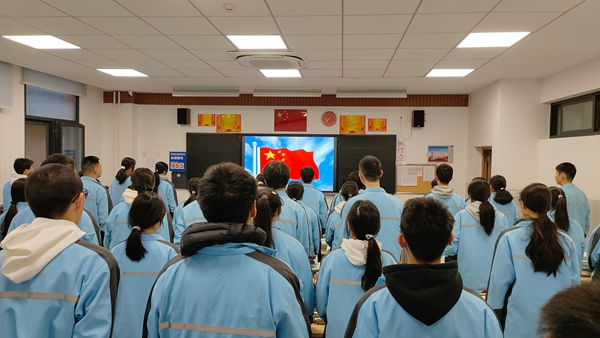 伴隨著雄壯的國歌聲,師生們昂首挺胸、肅然佇立,目光堅毅地凝視著冉冉升起的五星紅旗,嘹亮的歌聲回蕩在校園。