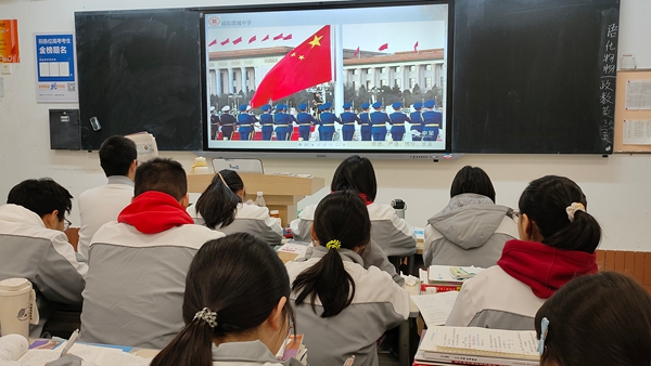 伴隨著雄壯的國歌聲,師生們昂首挺胸、肅然佇立,目光凝視著冉冉升起的五星紅旗,嘹亮的國歌旋律在校園回蕩,滿含赤誠與敬意。