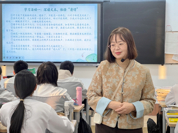 青年教師李佳怡則立足新穎的教學視角,構建以學生為主體的課堂框架。她以學生為中心搭建課堂框架,通過小組探究、情境沉浸式體驗等互動形式,充分調動學生參與熱情,引導學生在自主思考、協作交流中深度體悟荷塘月色的空靈意境與文字之美,彰顯了青年教師的教學活力與創新意識。