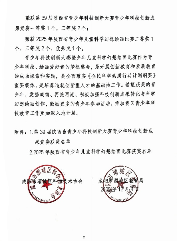 喜報:咸陽渭城中學師生在第39屆陜西省青少年科技創新大賽青少年科技創新成果競賽中獲獎